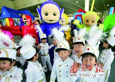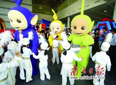 东莞“漫博会”上孩子们与原版天线宝宝人偶亲密接触。