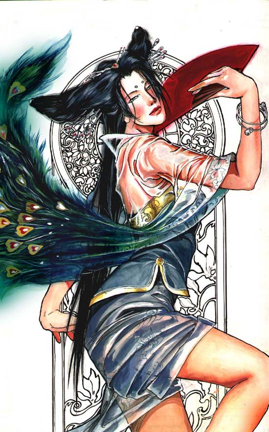 我不太赞成她的发型像孔雀.....夸张了点是~几好几好,就是我认为画要负合主题嘛.... |