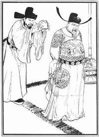 己想象的境界是跟着主要人物来转移的,碰到周围的人物也就不能不对他有一定的态度。这还不够,有时我还得以这个非主要的人物身分来参加事件。比方说《十五贯》里尤葫芦有一群邻居,秦老头是卖酒的,我想其他也可能有卖布的和打铁的等等。我并非要表现其职业,只是想表现他们对这个突然事件的态度。画中一个长连鬓胡子的,我假设他是个铁匠,他听到苏戌娟奸逃,没问十分明白就挽起袖子跟着别人去追,我若是他一定要把奸夫和苏戌娟痛打一顿。追上苏戌娟之后他就双手插腰准备动手,检查十五贯钱时他上来和熊友兰撕拦。公差把这一干人犯带走时,这位好心的铁匠听到苏戌娟哭诉冤屈弄不清是真是假,也有点弄不清自己做的事是否正确了。《王者》里也有这样的例子:饷银丢了之后,一向太平无忧的州佐还没有从突如其来不可思议的事件上中清醒过来,站在牌坊门洞里举着灯笼东张西望,在意识中还怕雨淋着。可是被抓来的农民则不管雨大雨小先跑去看看自己的牲口是否还在槽边。有时我也忽略一两个"不重要的角色",一些概念的公式的人物就会在我的画中出现,好象不拿薪水的底包,叫人看了厌恶。这也就是我不敢轻视他们的原因。