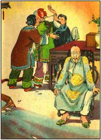 画《王者》时就不同了,起初确有过惰性,仍然用纤细秀丽的线描来表达,逐渐地自己感到"不解渴"了。(《王者》的第十二幅巡抚坐在椅子上发抖,就还残留着画《天仙配》的笔迹。别的都改画了,就这一幅没有改。)构思中的气氛境界促使自己要大刷在抹。同时故事虽假,自己的"生活"不假,想到怎么真实而具体的程度,就尽量表达到怎么程度,由于气氛阴森自然而然地就抹上了调子和阴影。(如果不这样真实具体,读者就会说这有什么值得大惊小怪的。而故事里一位巡抚大人会吓死,那就讲不通了)在初画《王者》时用的是横幅,后来画大门楼时才改用立幅;鸟瞰的手法也是随着故事情节需要而产生的,而不是先想到要在构图上来个奇特手法。